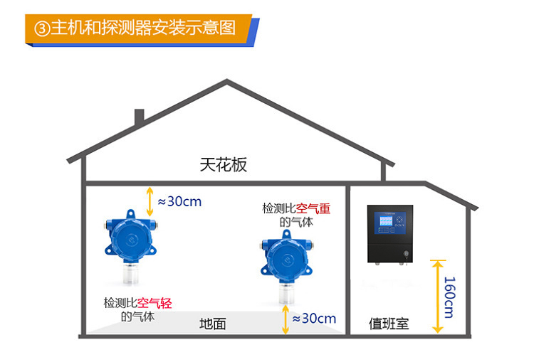 根据气体的比重及风向,探测器应安装在离气体可能泄露地点处1m范围内,以便探测器能够在被检测气体浓度超标时快速反应。