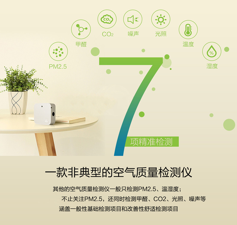 PM2 .5、CO2、 甲醛、PM10(光照可选配)、 噪声、 温度 、湿度同时检测;
