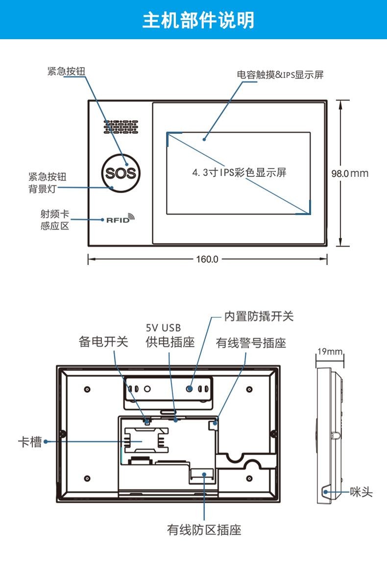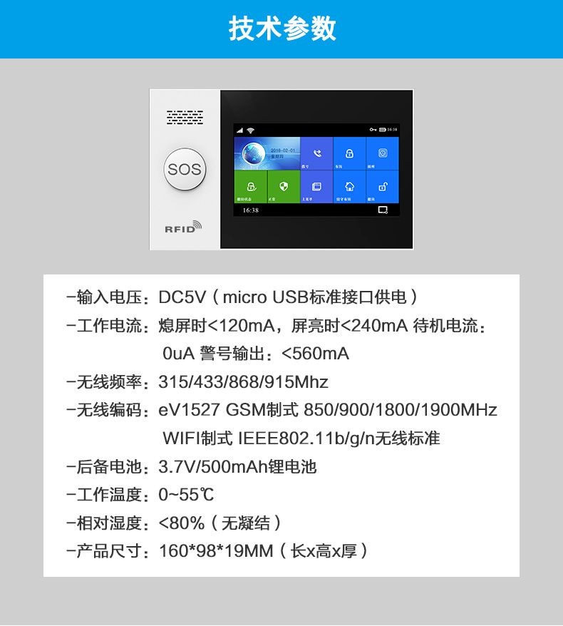 6.100路无线防区,4路有线防区,可配10个RFID卡,可配100个无线 配件