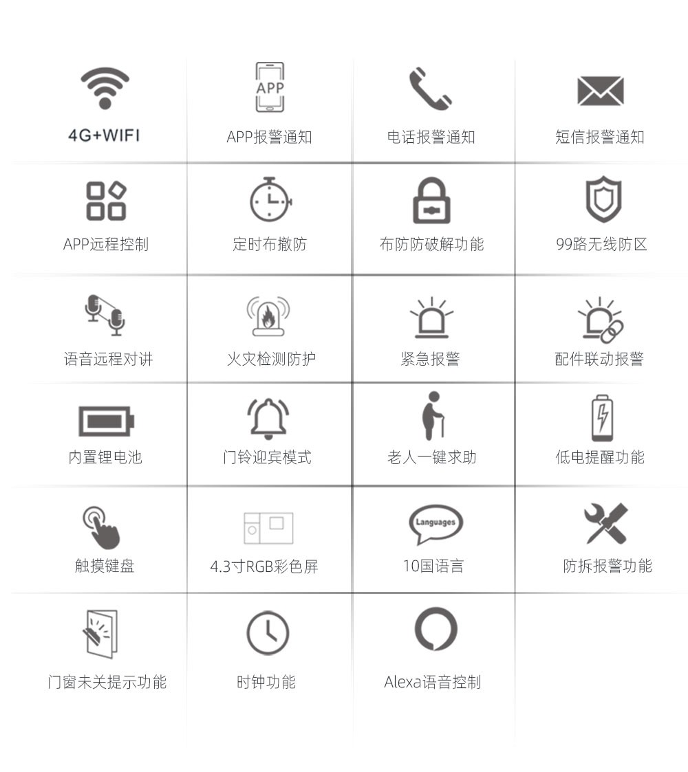5.Wi-Fi/GSM/GPRS联网报警器,支持APP推送、短信、语音监听、中心联网等多通道报警方式,确保报警性能稳定可靠。