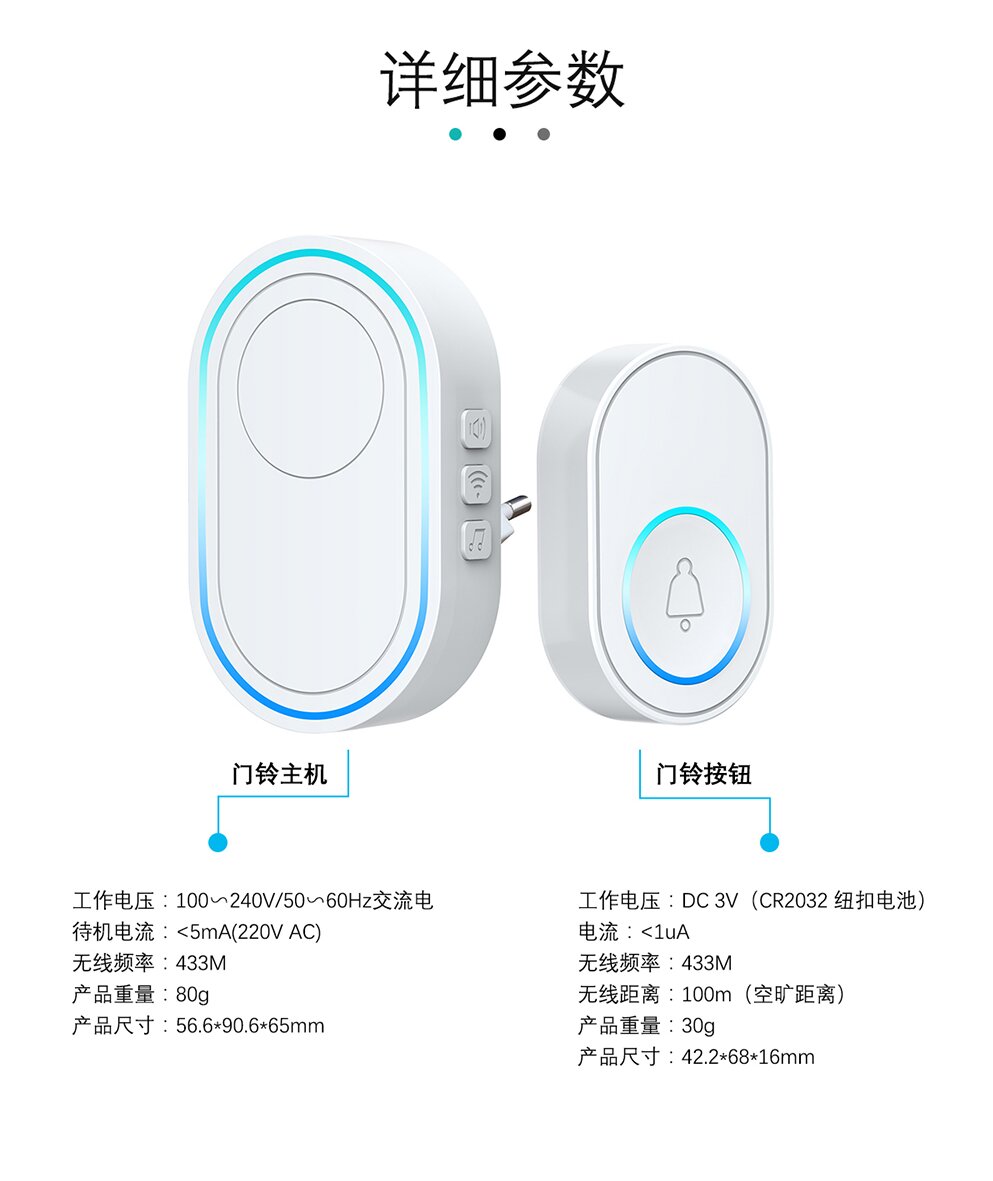 6 产品重量:80g(门铃主机)30g(门铃按钮)
