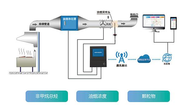 HG-200油烟在线监控仪是根据餐饮业油烟污染特性,并结合餐饮业油烟污染治理、运营维护管理经验,研制的一套餐饮业油烟污染监控设备,能够连续检测安装单位的油烟浓度、非甲烷总烃浓度、臭气浓度(异味)等指标,并通过无线信号(2G/4G/NB)即时将数据上传至油烟在线监控云平台,供环保、城管、高校、酒店、餐厅等政府部门及公司用于油烟排放的连续监测和监管。
