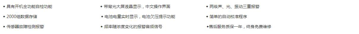 | 预热时间 | 10秒 | 音频指示 | 85dB 蜂鸣频率越高表明浓度越高 |